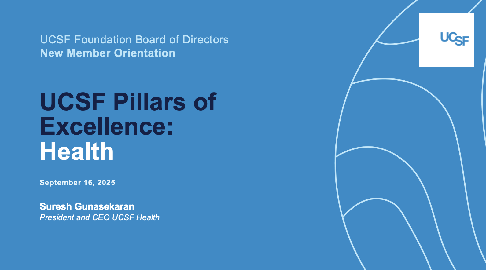 Branded Presentation Deck (2025): Created for the UCSF Board of Directors New Member Orientation to be used by both the UCSF President/CEO, and UCSF Executive Vice Chancellor to give an overview of the insinuation’s education and health enterprises, current data, and inspire the new board members.